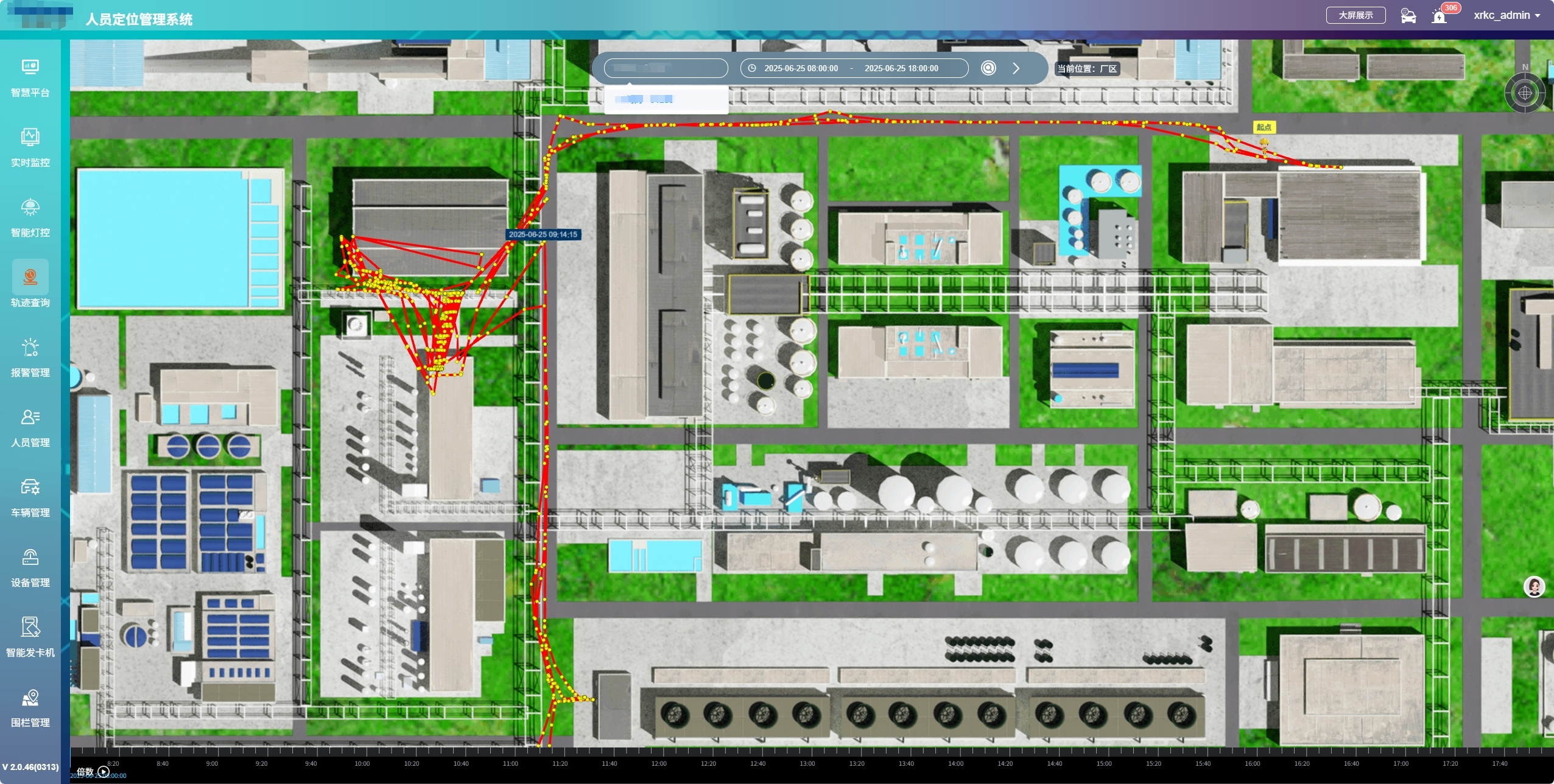 系統(tǒng)自動(dòng)保存人員和車輛的歷史軌跡信息,可一鍵查詢過去一段時(shí)間內(nèi)的移動(dòng)軌跡。這一功能在事故調(diào)查、作業(yè)流程優(yōu)化以及人員行為分析等方面具有重要意義。