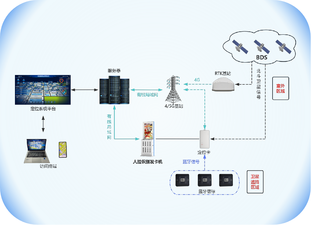 此外,該系統(tǒng)在定位覆蓋的全面性上也展現(xiàn)出部署優(yōu)勢(shì)。露天礦山既有開(kāi)闊的采場(chǎng),也有狹窄的運(yùn)輸巷道、設(shè)備密集的作業(yè)區(qū)等復(fù)雜區(qū)域。通過(guò)合理規(guī)劃RTK基準(zhǔn)站的位置,可以實(shí)現(xiàn)對(duì)大面積開(kāi)闊區(qū)域的全覆蓋;而在信號(hào)較弱的復(fù)雜區(qū)域,通過(guò)增設(shè)藍(lán)牙信標(biāo),能夠形成密集的定位網(wǎng)絡(luò),確保每個(gè)角落都能被精準(zhǔn)定位。這種“廣覆蓋+高精度補(bǔ)充”的部署模式,無(wú)需依賴單一技術(shù)的極限性能,而是通過(guò)技術(shù)融合和優(yōu)化部署,實(shí)現(xiàn)了對(duì)礦山全區(qū)域的無(wú)死角定位覆蓋,滿足了不同作業(yè)場(chǎng)景下的定位需求。