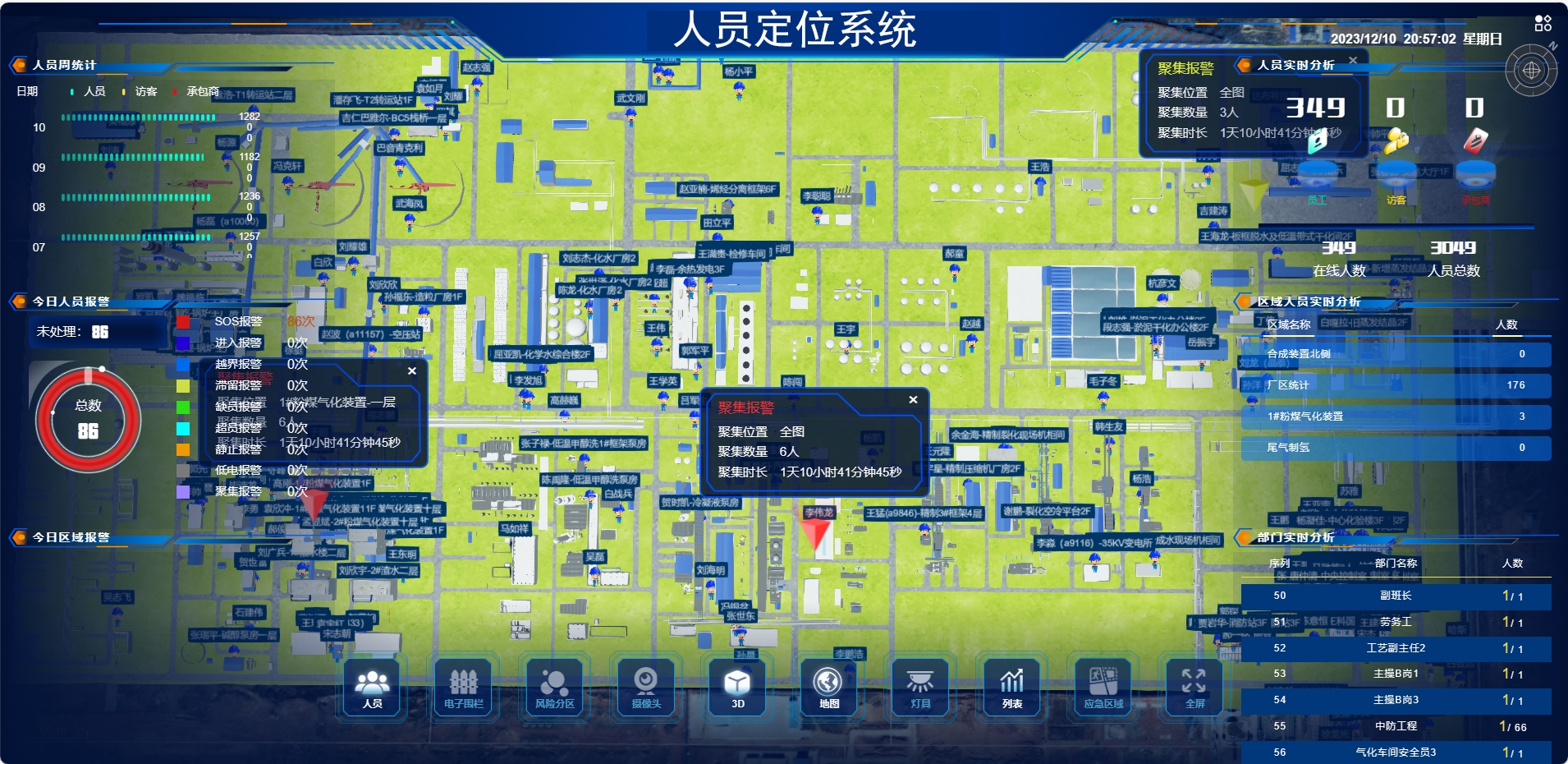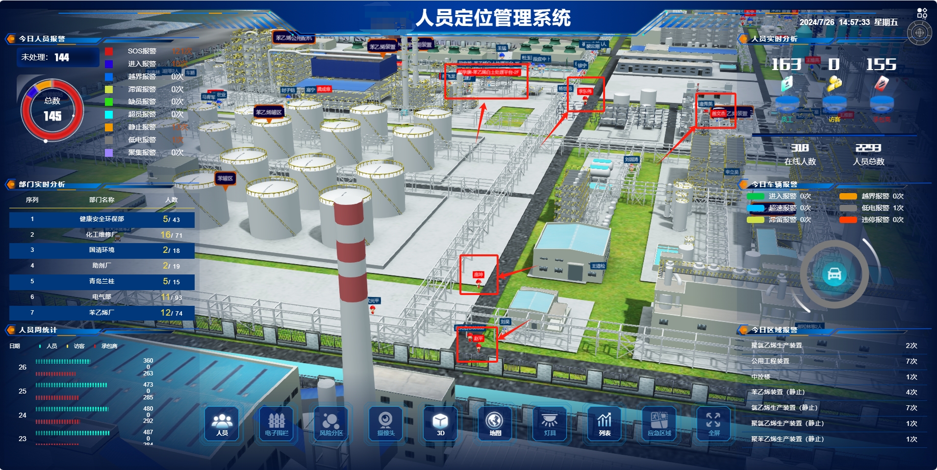 系統以直觀的2D或3D電子地圖為載體,實時展示人員和車輛的精確位置,支持按照部門、工種等多種方式進行分類查看。管理人員可隨時選擇特定人員或車輛進行實時追蹤,全方位掌握其行動軌跡和當前狀態,實現對現場作業的實時監控與有效指揮。