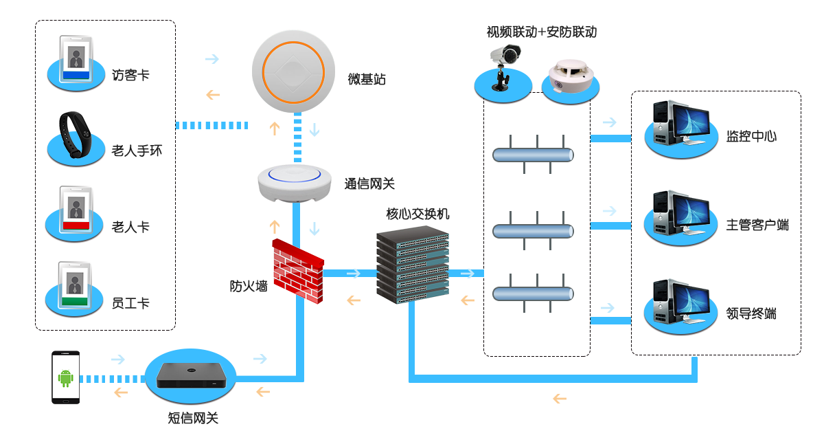 養(yǎng)老院人員定位系統(tǒng)應(yīng)反應(yīng)養(yǎng)老公寓情況、增加老人安全防范級(jí)別、加強(qiáng)安全保障措施,部署物聯(lián)網(wǎng)設(shè)備及配套集成平臺(tái)軟件,實(shí)時(shí)定位人員信息及時(shí)反應(yīng)老人救助行為,實(shí)現(xiàn)與視頻、門禁一卡通等自動(dòng)化監(jiān)管設(shè)施聯(lián)合動(dòng)作,提高應(yīng)急響應(yīng)速度和事件的處置速度,有效提高養(yǎng)老公寓的管理水平和管理效率,同時(shí)為老年公寓運(yùn)營(yíng)管理提供可參考的大數(shù)據(jù)信息,便于養(yǎng)老公寓合理分配資源,為老人提供更加的服務(wù)。