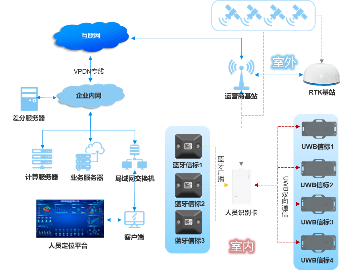 新銳科創(chuàng)基于多模融合定位技術(shù),自主研發(fā)了4G+藍牙+UWB+GPS/北斗RTK融合定位系統(tǒng),該系統(tǒng)以衛(wèi)星為主要定位手段,利用RTK差分定位技術(shù)提升衛(wèi)星定位精度,利用藍牙或UWB來輔助衛(wèi)星定位,彌補衛(wèi)星信號在某些區(qū)域覆蓋的不足,保障衛(wèi)星信號較弱區(qū)域的定位精度,從而實現(xiàn)室外全場景覆蓋的高精度定位。系統(tǒng)拓撲圖如下: