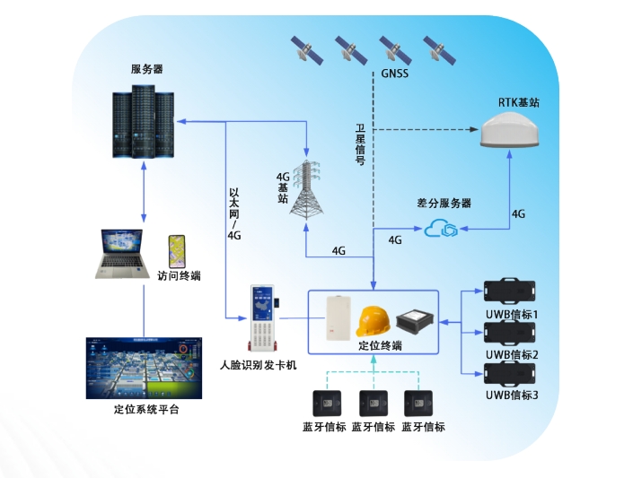 系統組成:該系統主要包括北斗RTK差分基站、UWB無線定位基站和藍牙信標。其中,北斗RTK差分基站負責室外區域的高精度定位,UWB無線定位基站則負責室內及遮擋嚴重區域的定位,而藍牙信標則作為輔助定位手段,實現低成本、廣覆蓋的定位。