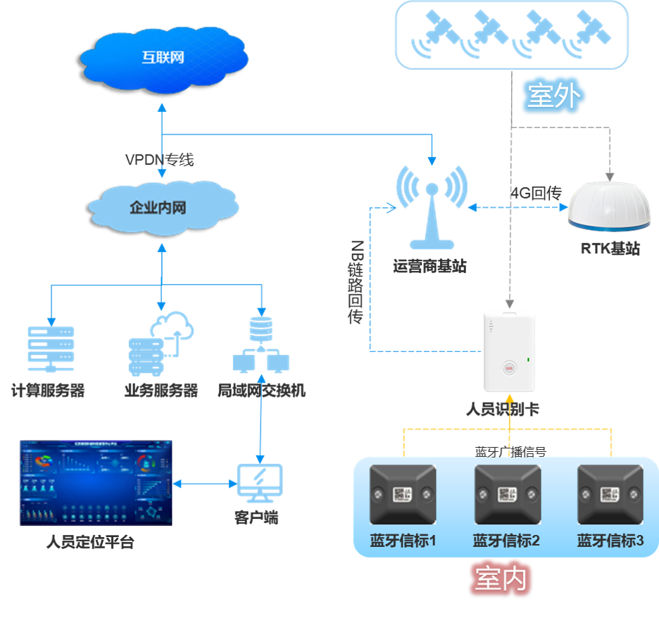 室外高精度北斗定位,衛星信號較弱區域及室內采用藍牙定位,只需安裝藍牙定位信標,佩戴人員定位識別卡就能實現室內外一體化定位,無需弱電施工,方便部署;